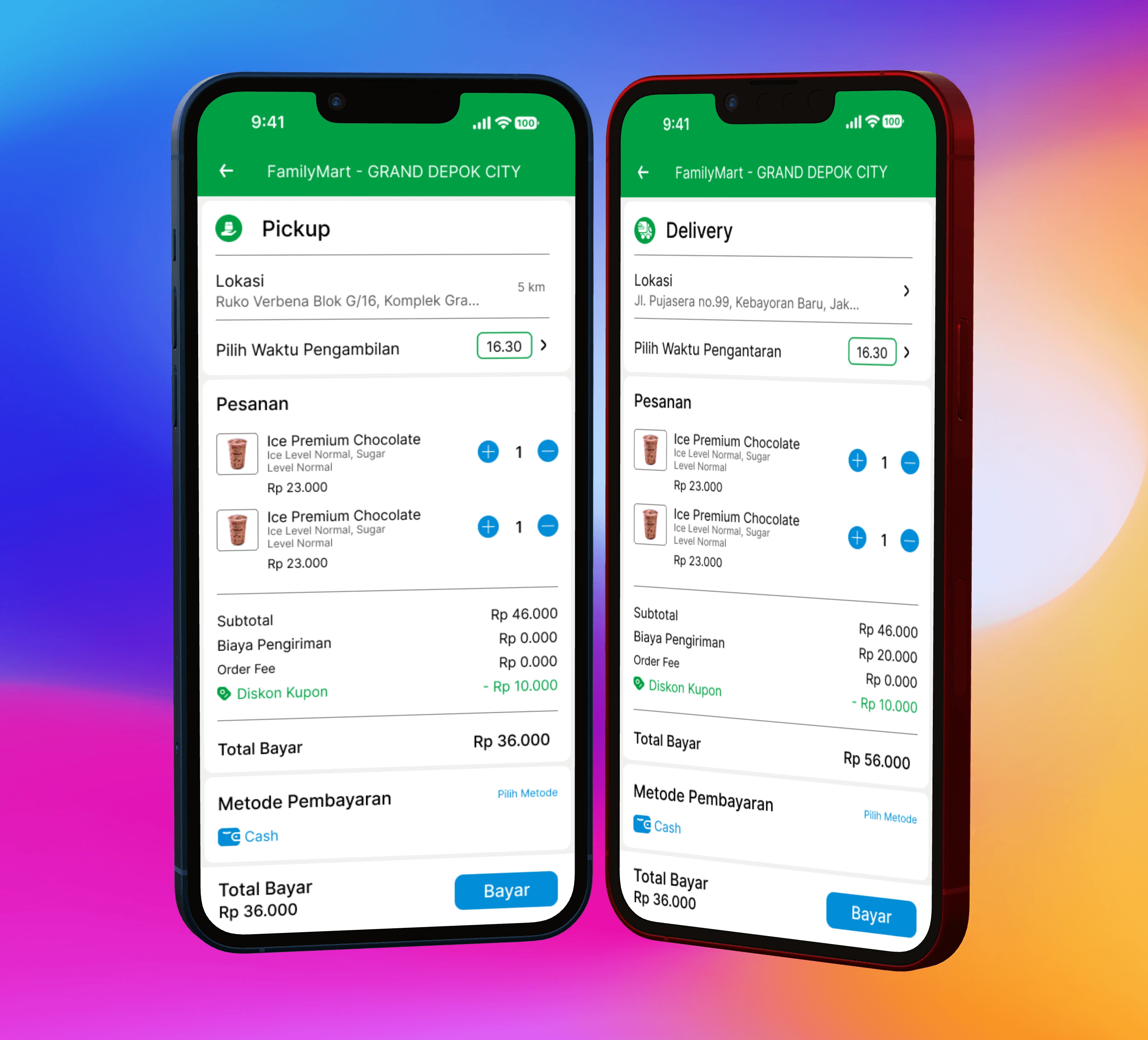In the new design, the Pickup and Delivery options are clearly separated, each with its own dedicated page. For Pickup, users can select their pickup location, choose a convenient pickup time, and view their order summary with a detailed cost breakdown, including discounts and payment options. The Delivery page similarly allows users to enter their delivery address, select a delivery time, and see a comprehensive order summary with delivery fees.