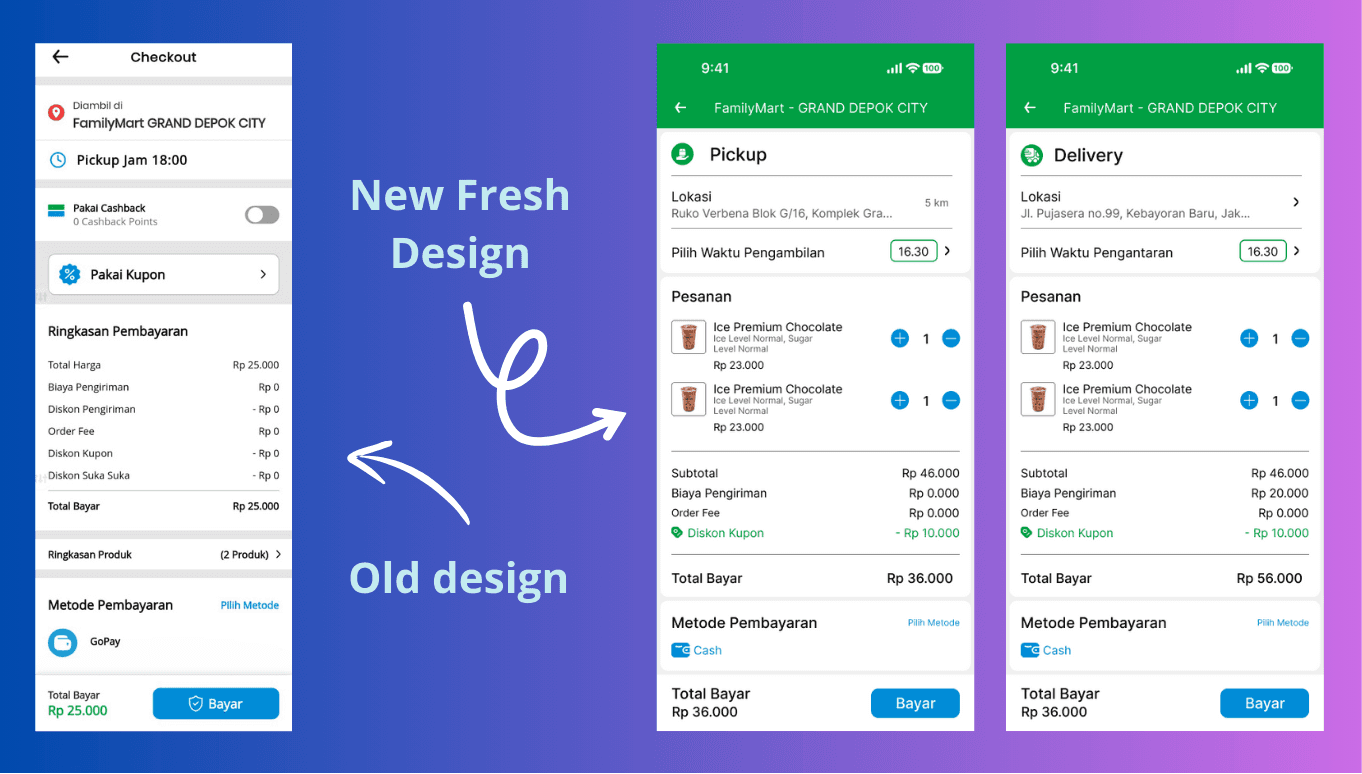 Both pages prominently display the total amount to be paid and provide an easy-to-select payment method, ensuring a smooth and intuitive checkout experience. Its neat and organized arrangement enhances the checkout process, enabling users to complete it quickly and efficiently. The redesign improves the overall user experience by making the process straightforward and visually appealing.